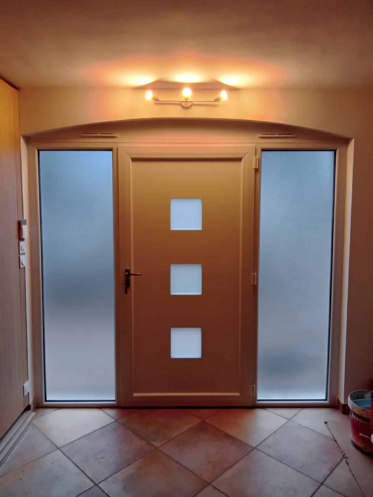- Châssis Fixes : Pour accompagner la porte d’entrée, deux châssis fixes identiques ont été installés de chaque côté de celle-ci. Ces châssis, mesurant 673 mm de large par 2085 mm de haut, sont également de couleur blanche et équipés d’un vitrage thermique, contribuant ainsi à l’isolation générale et à l’harmonie esthétique de l’ensemble.