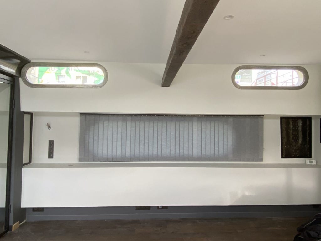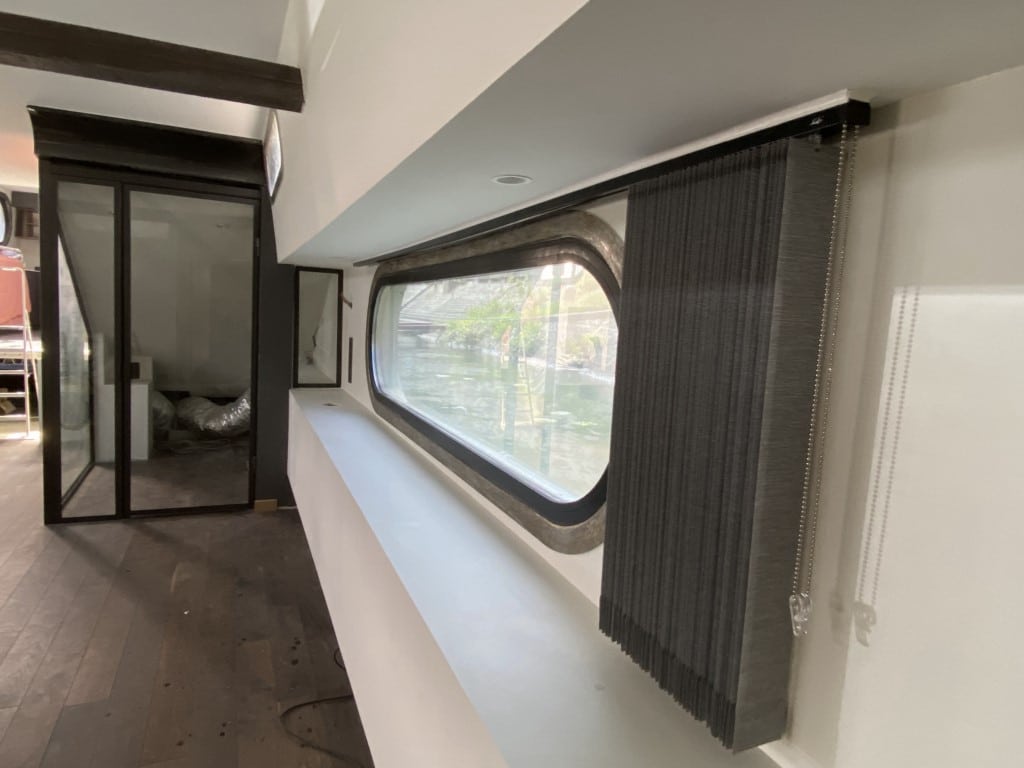 Nous avons installé un store à bandes verticales californien, un choix idéal pour les grandes baies vitrées typiques des péniches. Ce store de la marque reconnue Luxaflex présente des bandes en tissu de 89 mm, offrant un contrôle précis de la lumière et de la visibilité. Les bandes de tissu, en plus de leur fonctionnalité, ajoutent une touche d’élégance et de modernité à l’intérieur de la péniche.